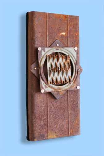 The base is a toolbox lid; the squares & circles are miscellaneous treasures. The texture center is a joining plate. These are all joined by"pegging" through holes drilled, & sealed with epoxy on the under side. This was quite fun to create !